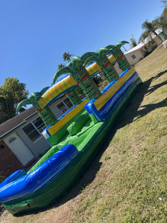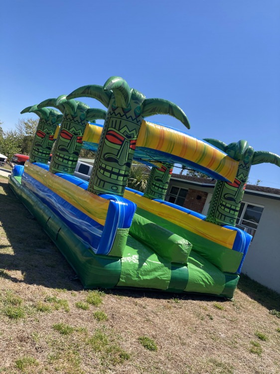 40ft Tiki Splash Double Lane Slip N Slide is here to make your summer splash parties the most exciting event in town! This vibrant and exhilarating inflatable brings the tropical island vibes right to your backyard, delivering 40 feet of pure slip-sliding fun that will have everyone lining up for their turn. With its colorful tiki design, dual lanes for friendly competition, and long stretch for high-speed action, the 40ft Tiki Splash is the ultimate addition to any event craving energy, water, and unforgettable memories.